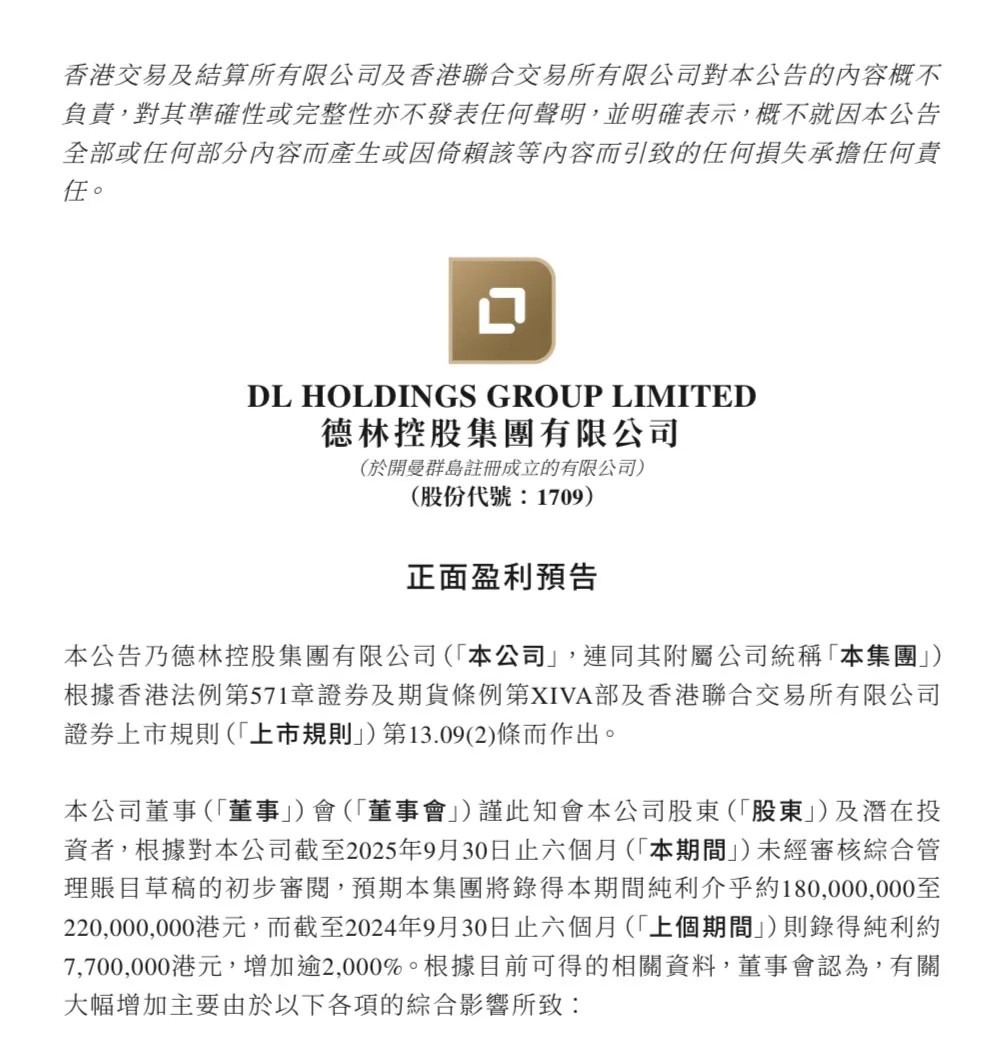 德林控股發布盈喜預告:2025財年溢利預增10%-30%或達1.3億港元